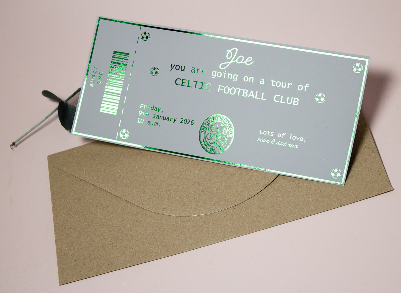 Make memories — not admissions. Our high-quality foiled stadium tour tickets are printed on thick, premium paper with metallic foil accents for a real, collectible feel. They look and feel like the real thing but are strictly novelty keepsakes: they do not grant access to any match, tour, or event. The perfect way to gift; turn those email confirmations into something lovely!